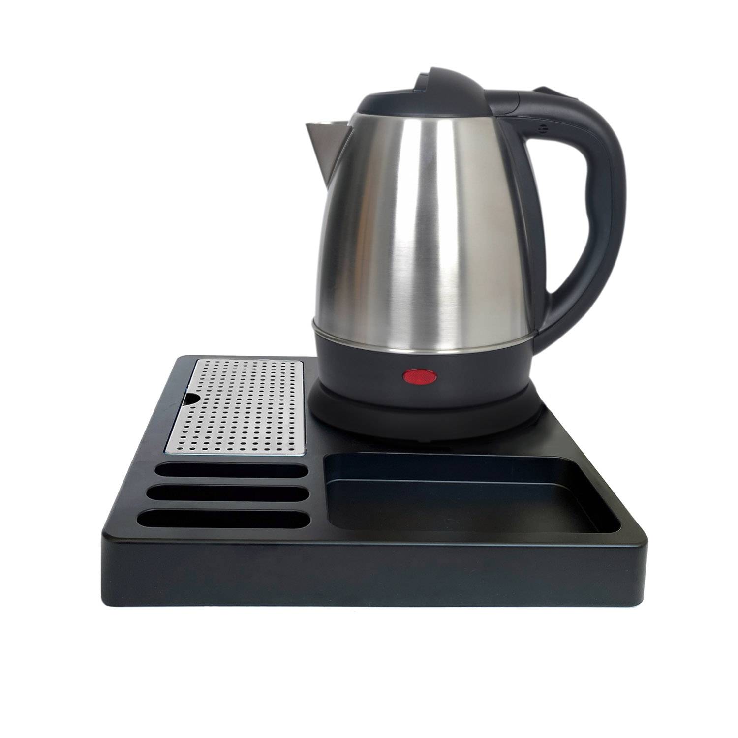 Чайный гостевой набор состоит из подноса с разъемом для подключения электрического чайника, подcтавки для чашек и отсеков (для пакетиков, ложек).