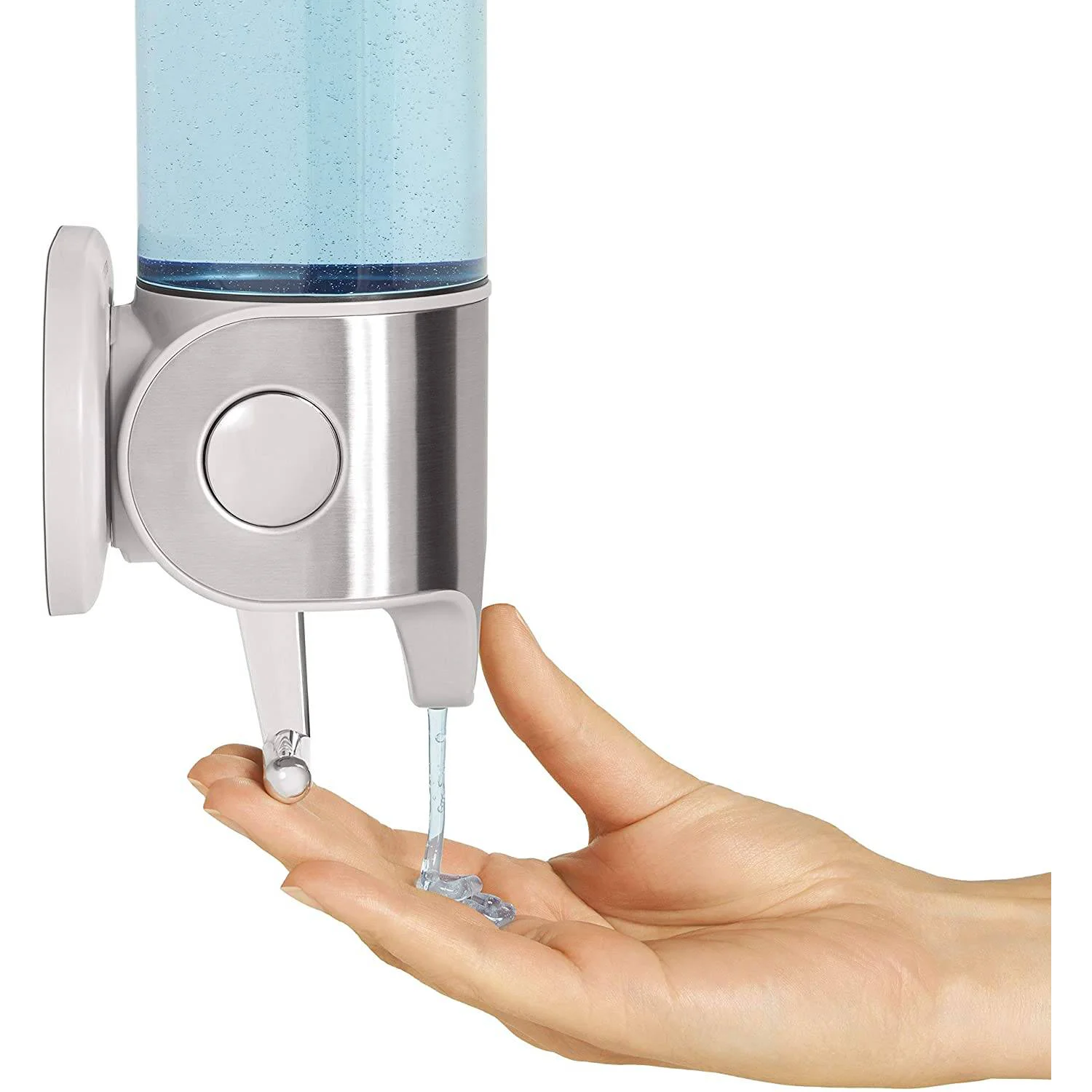 Предназначен для использования любого вида мыла. Тип дозатора: рычажный, наливной. Прозрачный корпус позволяет удобно отслеживать количество мыла или геля для душа внутри него. Крючки сбоку дозатора позволяют разместить станок для бритья, мочалку для мытья и другие аксессуары. Изготовлен из нержавеющей стали с сатиновой отделкой. Можно крепить на стену с помощью силикатного клея либо шурупов. Крепеж в комплект не входит.