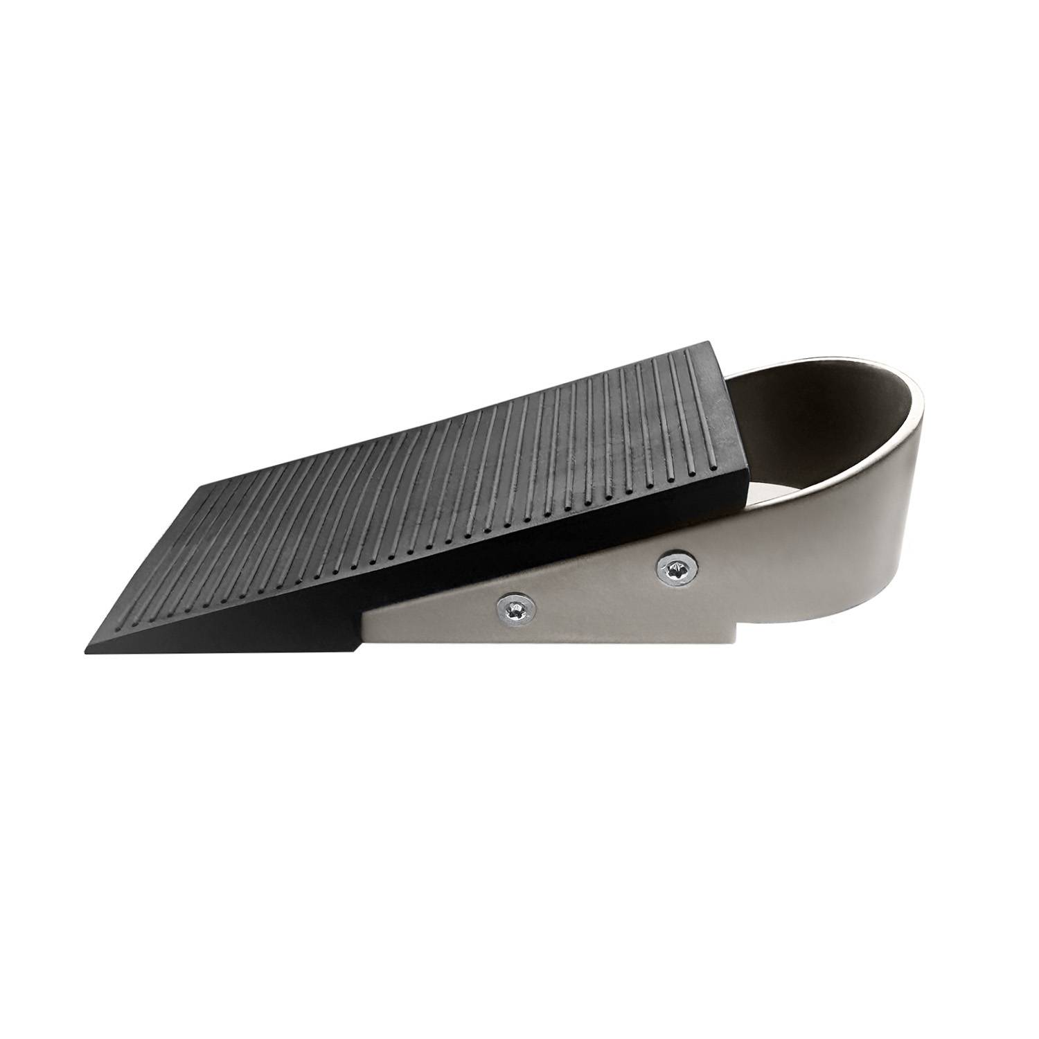 Підлоговий клиноподібний стопор. Поєднання металу та гуми для надійного зчеплення. Підходить для пластикових, дерев'яних та металевих дверей. Запобігає пошкодженню стін та фурнітури.