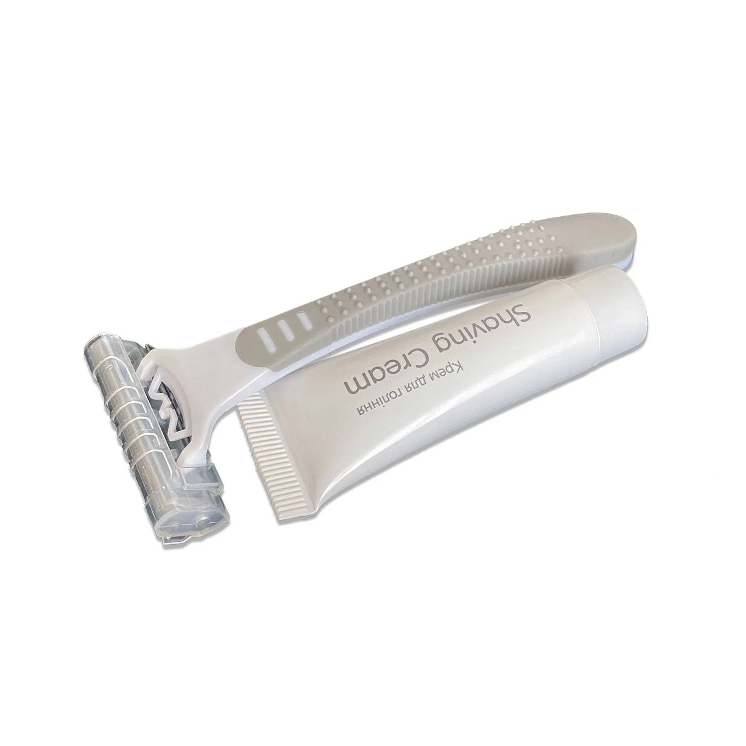 До складу набору входить - бритва з 2-ма лезами і крем для гоління, об'ємом 10 мл. Кожен набір упакований в індивідуальну поліетиленову упаковку.