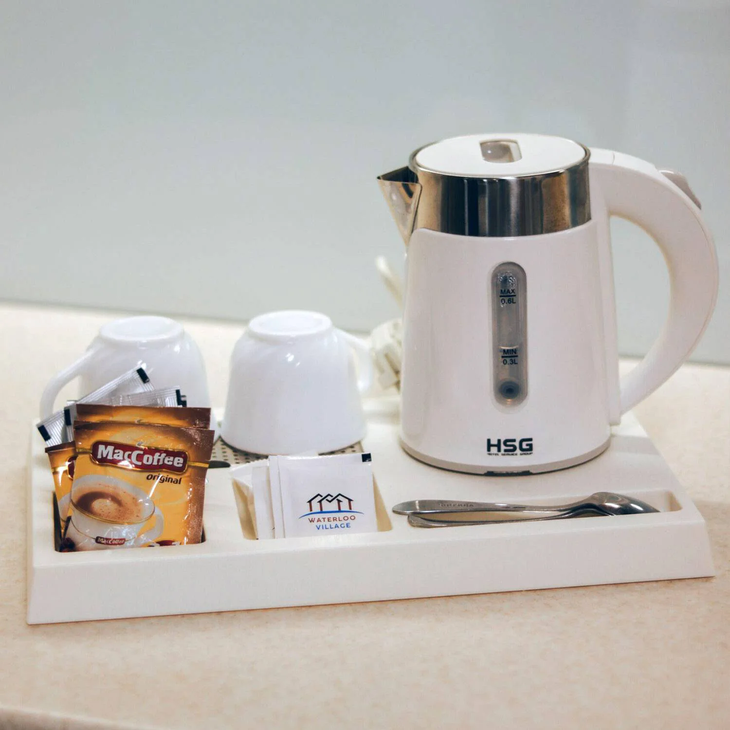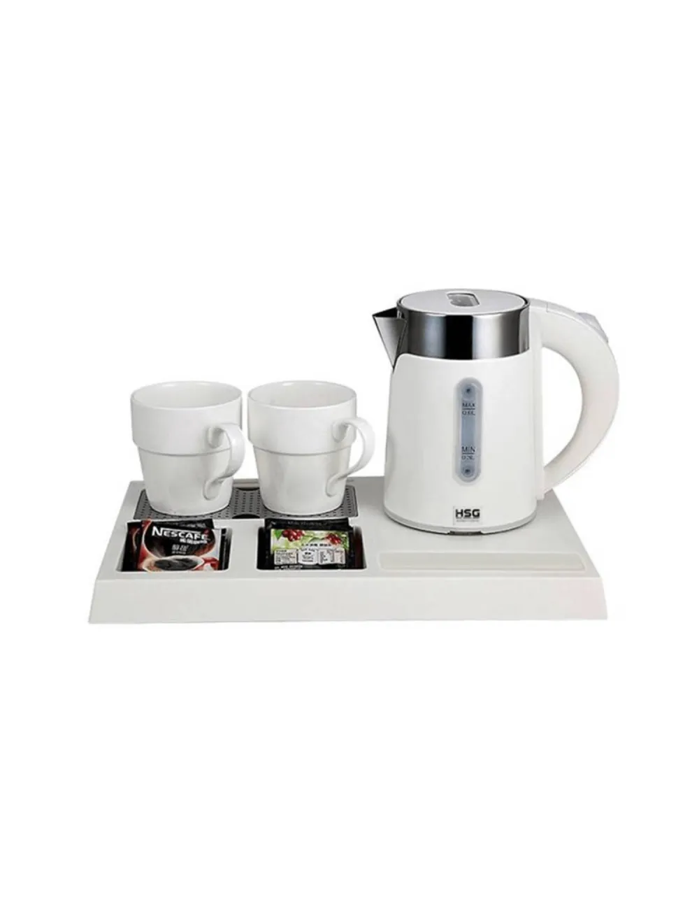 Чайний гостьовий набір складається з підноса з роз'ємом для підключення електричного чайника, підcтавки для чашок і відділень (для пакетиків з чаєм/кавою, ложок).