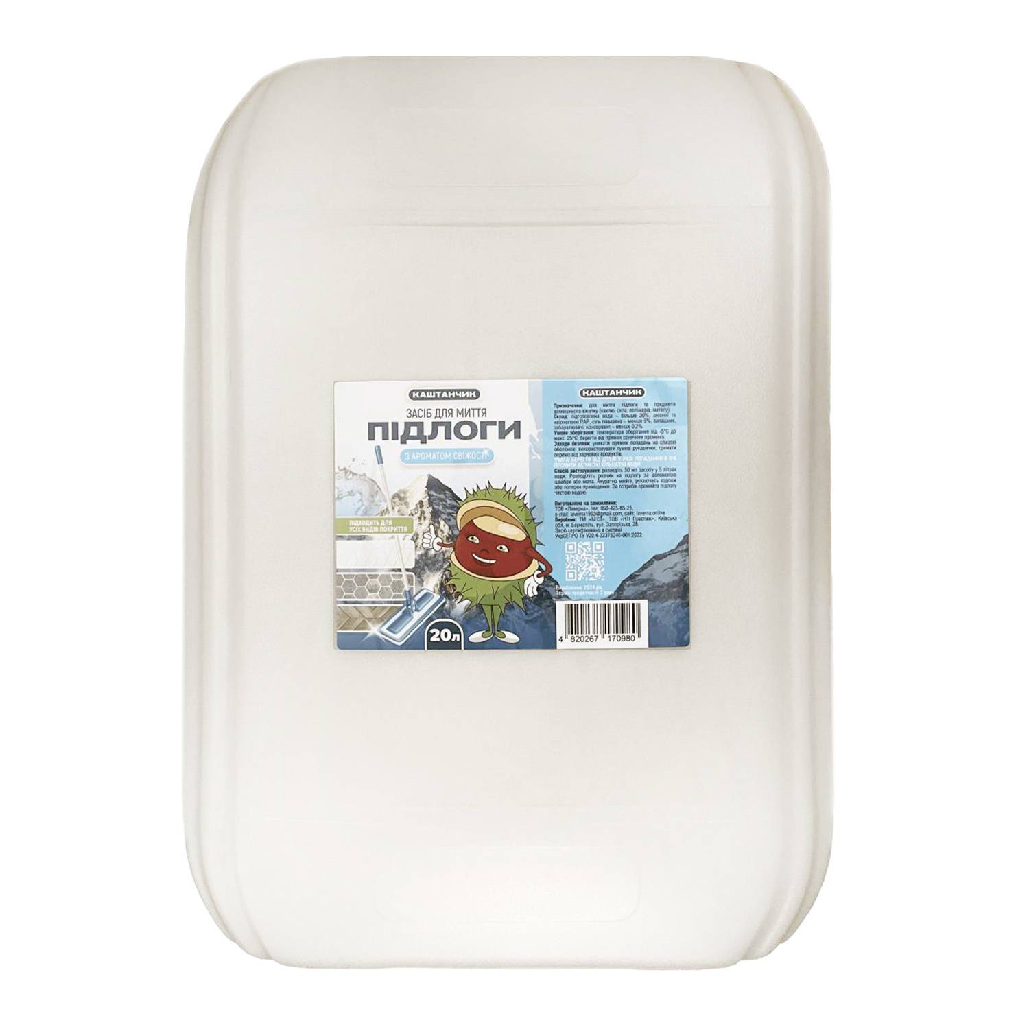 Засіб для миття підлоги «КАШТАНЧИК» — це мийний засіб, що підходить для миття різних поверхонь: лакованого паркету, ламінату, лінолеуму, кахельних і пластикових поверхонь, кухонних меблів, відер для сміття та ін.
