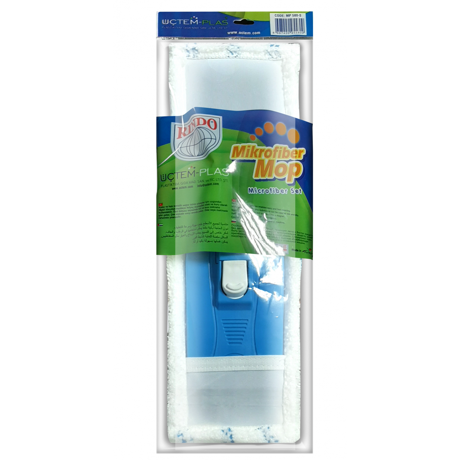 Готовий до використання набір, що складається з мопа, тримача та пластикової рукоятки.