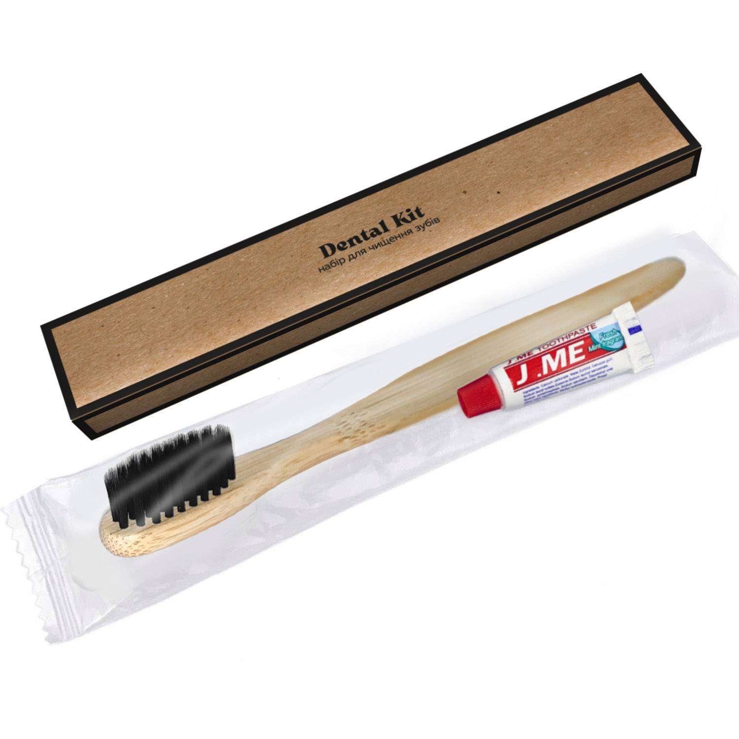 У наборі: дерев'яна зубна щітка 18 см з бамбуку та зубна паста J.ME 5 гр. Fresh Mint у стильній коробочці з крафтового картону.